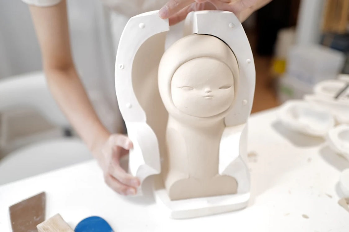 寺倉京古は、スリップキャストと手びねりの技法を組み合わせ、繊細な表情の乳幼児を陶彫で表現している。頬や鼻、唇にエナメルの釉薬や薔薇色の輝きを加えることで、作品に生命と個性を与えている。特に目を描くことに大きな感情を込め、その努力はまるでそれぞれの人物に魂を吹き込むかのようだ。彫刻が焼かれ、磁器が固まるにつれて、人々の祈りが込められた器となることが、彼女の願いである。