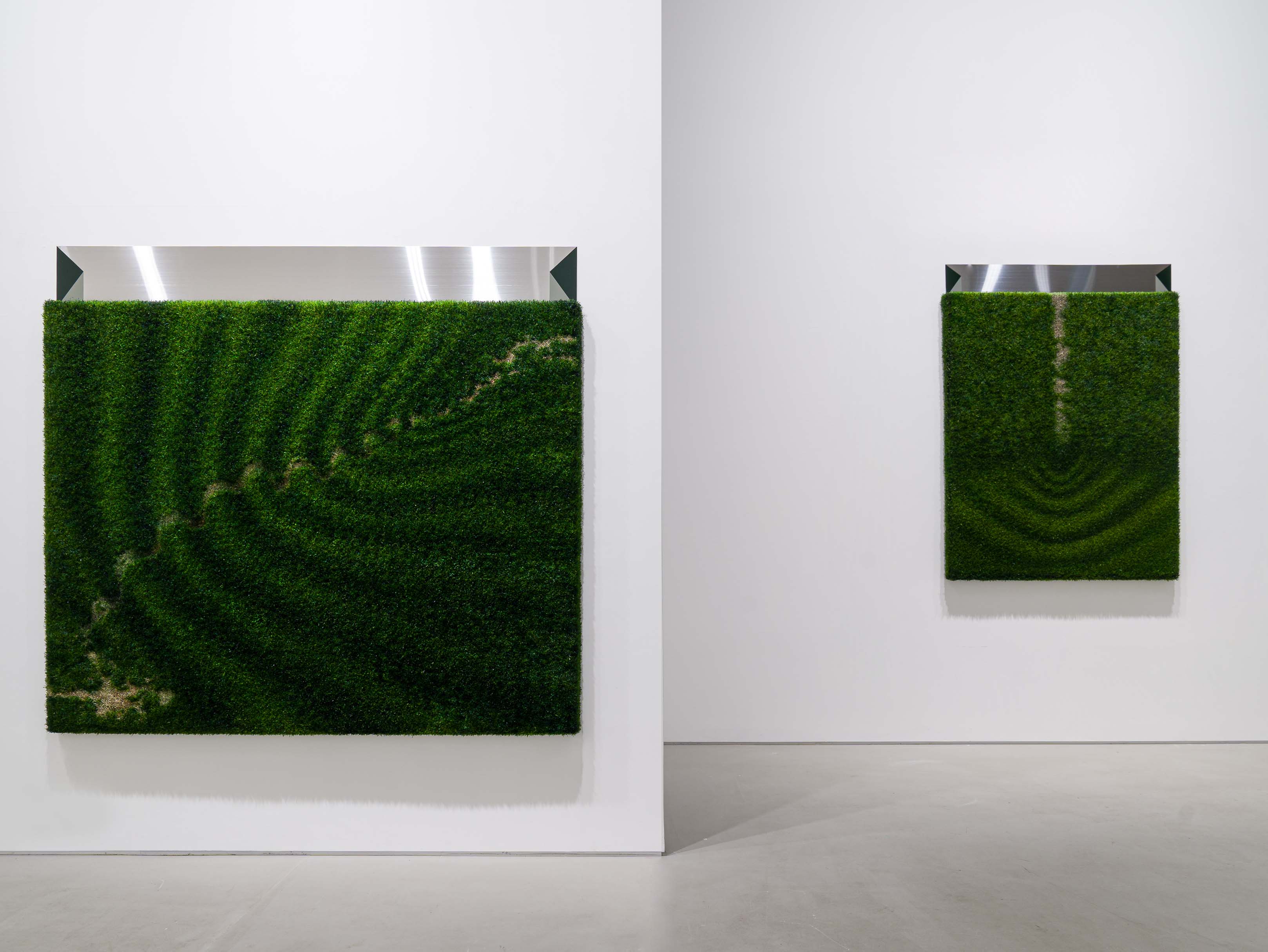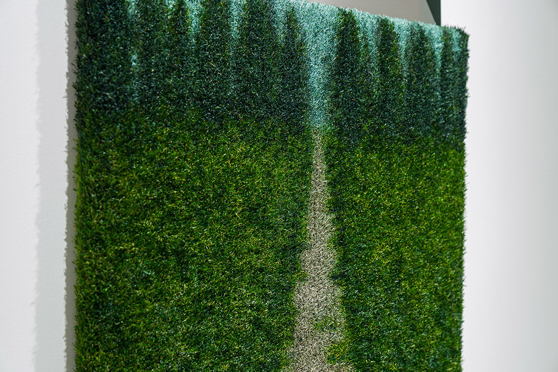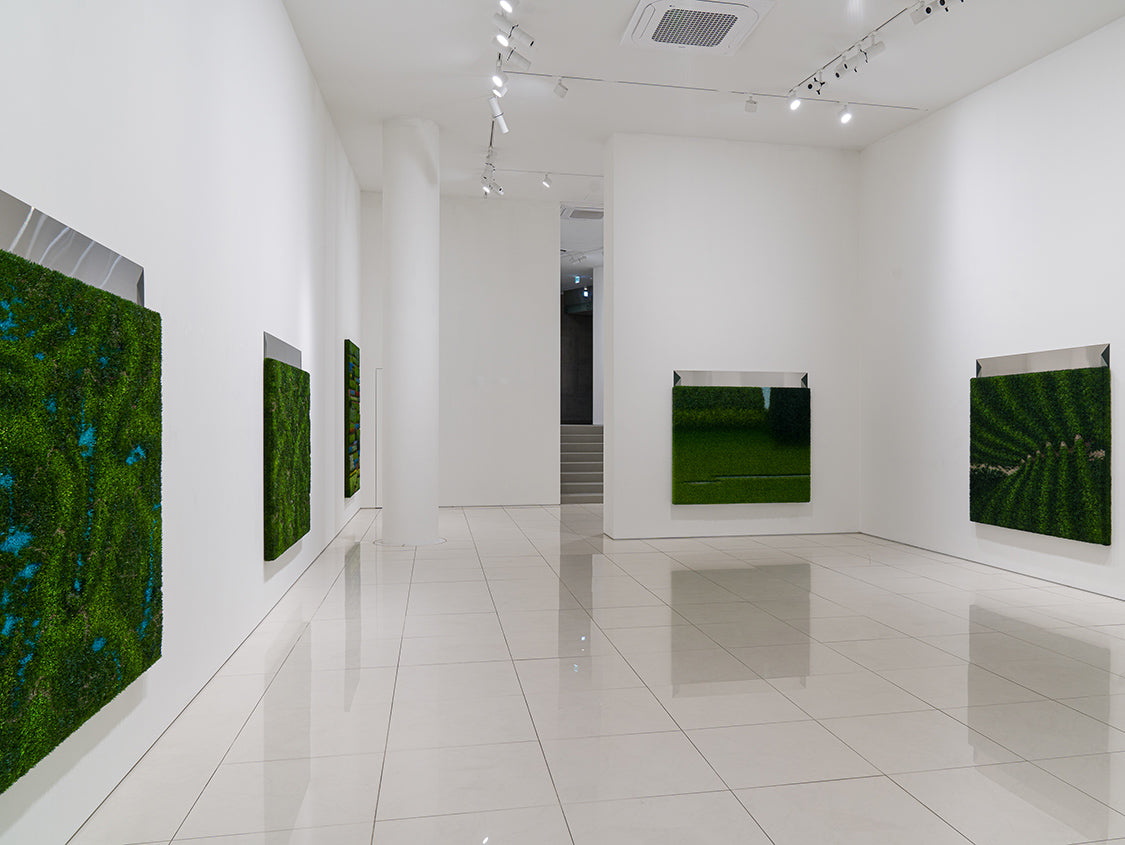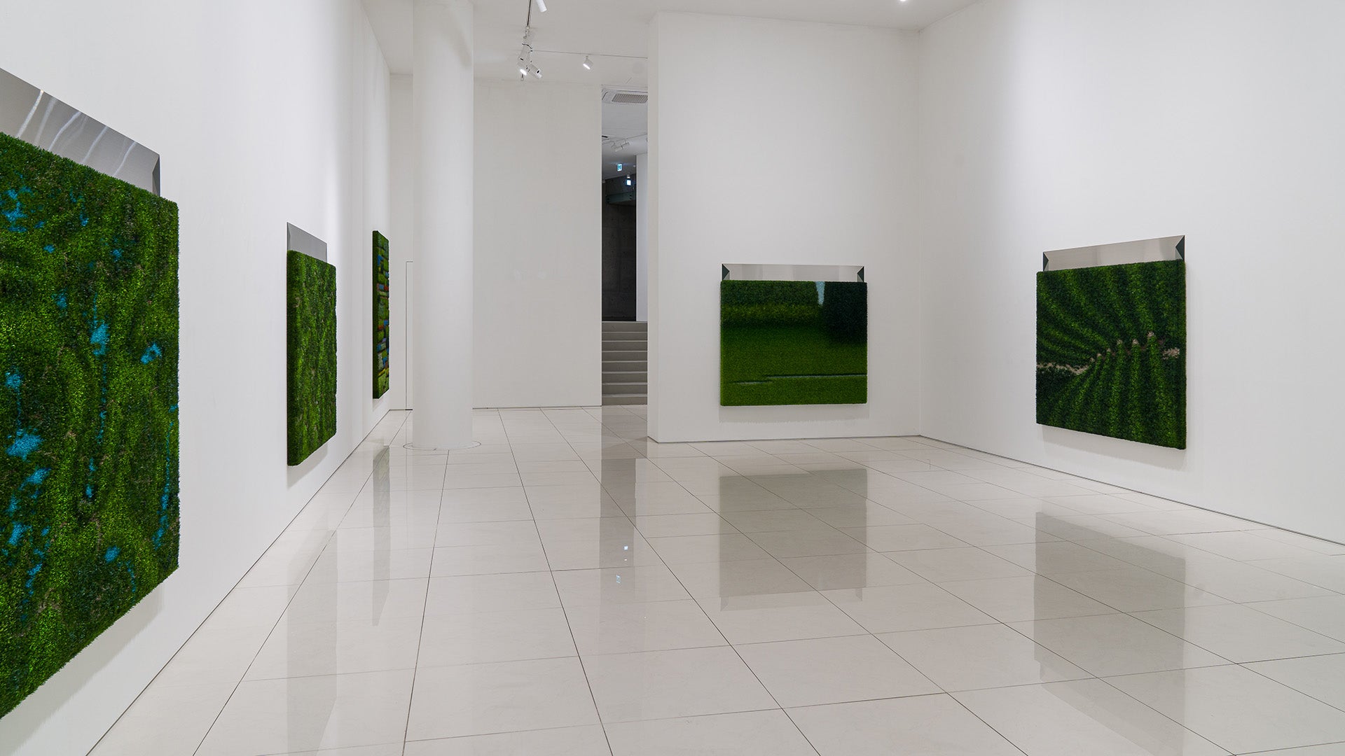 For the first time in this solo exhibition, Jung introduces new works crafted from an unconventional material: synthetic turf, instead of her usual handmade Korean paper. By using this every day, familiar material, the artist explores new directions in her genre and conveys a bold desire for artistic freedom. Her sweeping, dynamic brushstrokes and vibrant colors on the turf emphasize expressive freedom, breaking away from the restrained details of her earlier works to delve into more instinctive, sensory aspects of the self. Jung also incorporates shopping bags as a symbol of the exchange of material and spiritual resources, portraying peace as a fundamental human desire being transferred within these exchanges. Much like a shopping bag that carries and protects its contents, her works evoke the ways humans present themselves and the processes of transferring and sharing art. Her stainless-steel shopping bags represent durability and leave room for imagination, metaphorically embodying the essence of art.