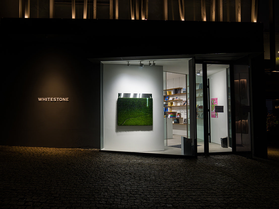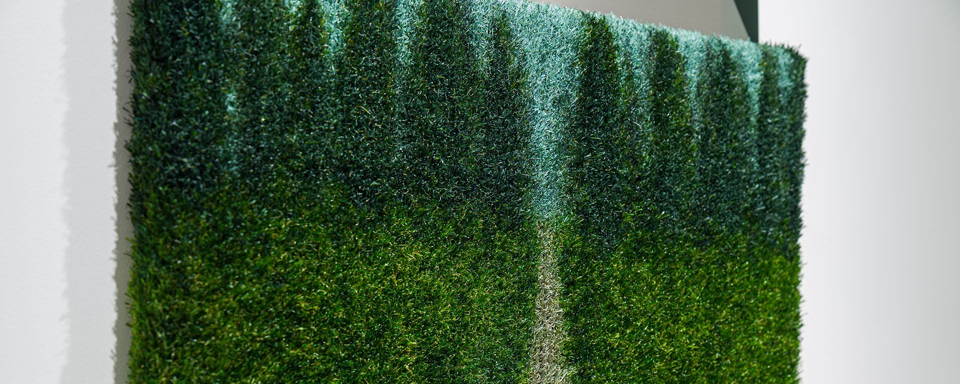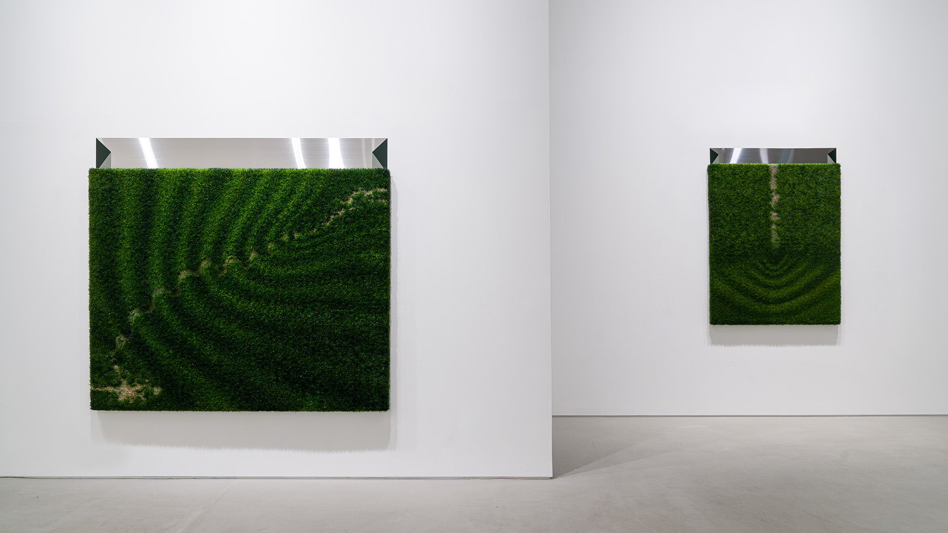 For the first time in this solo exhibition, Jung introduces new works crafted from an unconventional material: synthetic turf, instead of her usual handmade Korean paper. By using this every day, familiar material, the artist explores new directions in her genre and conveys a bold desire for artistic freedom. Her sweeping, dynamic brushstrokes and vibrant colors on the turf emphasize expressive freedom, breaking away from the restrained details of her earlier works to delve into more instinctive, sensory aspects of the self. Jung also incorporates shopping bags as a symbol of the exchange of material and spiritual resources, portraying peace as a fundamental human desire being transferred within these exchanges. Much like a shopping bag that carries and protects its contents, her works evoke the ways humans present themselves and the processes of transferring and sharing art. Her stainless-steel shopping bags represent durability and leave room for imagination, metaphorically embodying the essence of art.