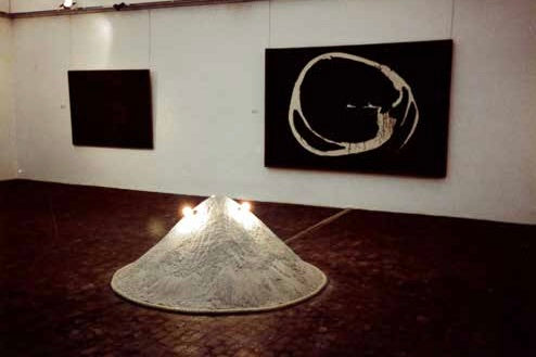 Now let’s look back at the works of Michio as a member of Gutai. The first exhibition after the start of Gutai was the 7th Yomiuri Independent in March 1955. Works by Gutai members were all titled “Gutai,” and three of them were by Michio. One of them (now in the collection of Ashiya City Museum of Art and History) was sheets of newspaper glued together and mounted on a wood frame of approximately size No. 150, to which oil paint was applied with something like a spatula. Supports made of newspaper are also seen in some works by Shozo Shimamoto since around 1952. It is supposed that Shimamoto taught the method to Michio. For “Open-Air Experimental Modern Art Exhibition Challenging the Midsummer Sun,” held in the summer of 1955, Michio made a work from junk or scrap. In the first Gutai exhibition in the fall of the same year, he exhibited oil paintings in Informalist style. But it was after these exhibitions that Michio began to create his original works, stimulated by other Gutai artists. In 1956, in the second edition of the open-air exhibition he showed a work comprising electric bulbs and water tanks buried in the ground; in the Gutai exhibition he exhibited paintings for the viewer to roll out and pictures on cellophane paper to be projected on the wall. In this period Michio got interested in light and earth, and made works mainly with these as material. Until around 1960 he exhibited paintings done with coal tar mixed with sand and pebbles. They looked like the ground hanging on the wall, and eventually became works to represent Michio. The unpaved streets in the city of Ashiya, where Michio lived at that time, were rapidly being paved with asphalt in those days. It could be said that these works reflected the era. As to works for the stage, in “Sound Performance,” performers dressed anonymously in white made various noises on the stage. “All Right, the Moon Won’t Fall,” a stage exhibition in 1962 of which title was taken from rock-’n’-roll that he adored, featured 10 performers on the stage who only moved their fingers and mouths delicately. In his private life, Michio formed a modern jazz band with friends and played the drums and guitar – typically in the 1960s style. During the latter half of the Gutai era, he produced works with paper tape filling the surface, and paintings that derived from that.
