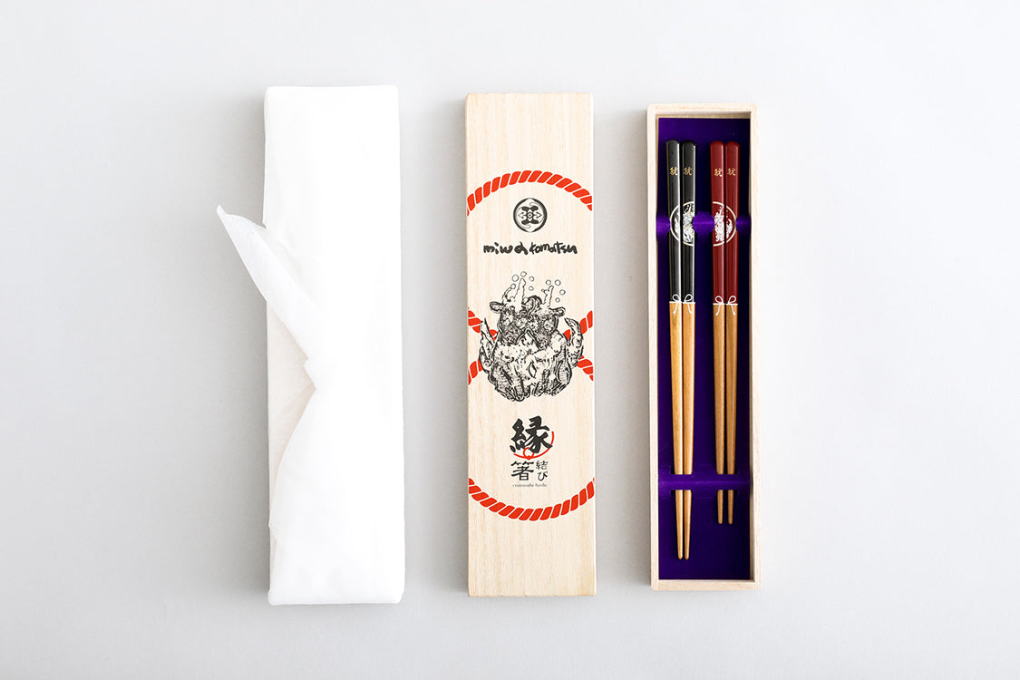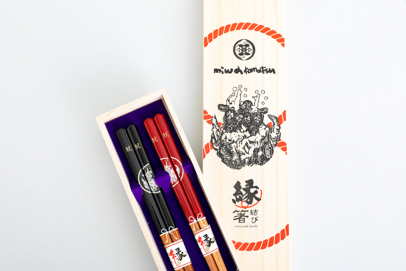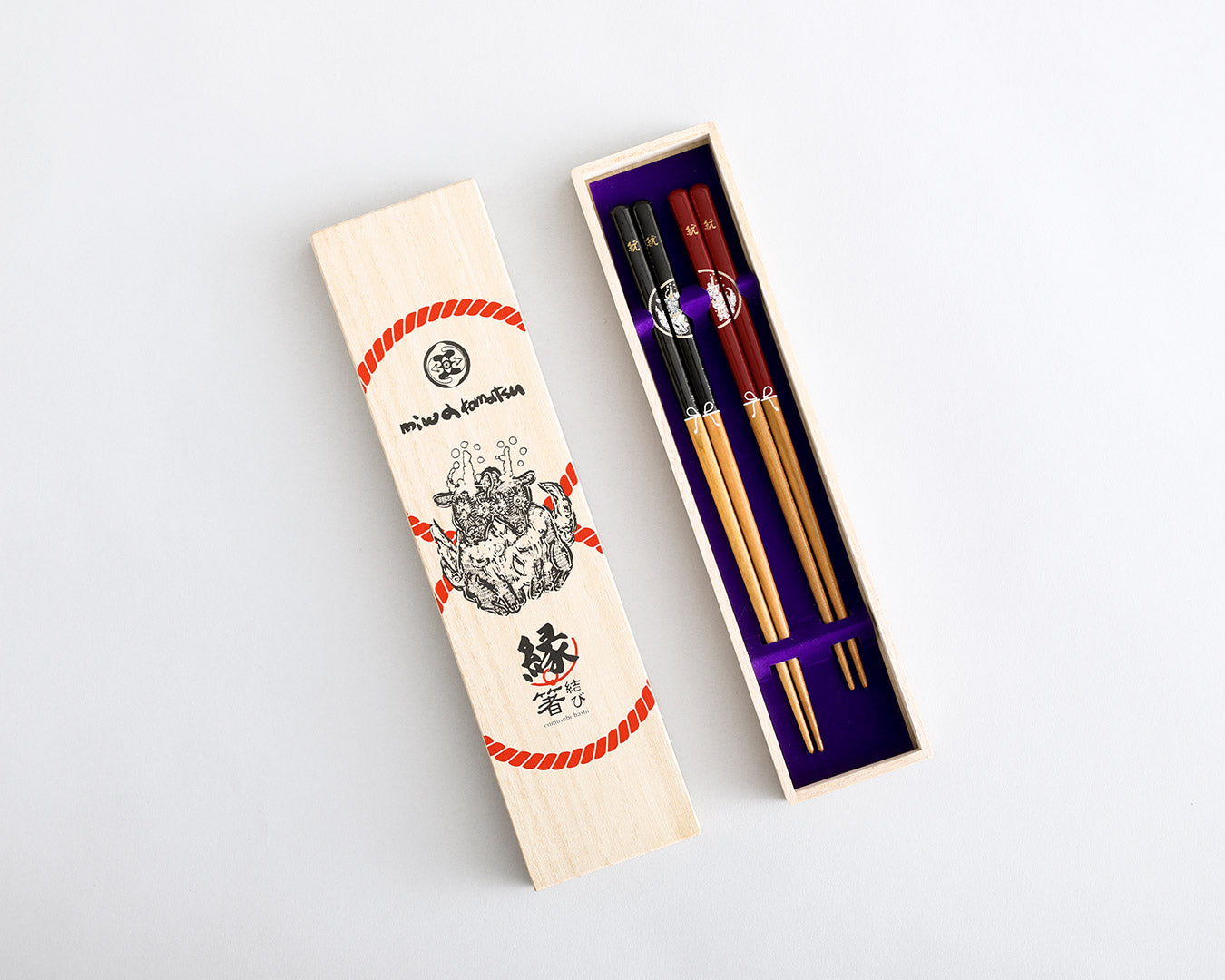 2014年に出雲大社へ作品《新・風土記》を奉納した小松美羽と創業明治40年出雲大社表参道に店舗を構える「縁結び箸ひらの屋」との間で生まれた「ご縁」を記念してコラボレーションが実現、構想から数年の歳月をかけ、今回特別仕様の「縁結び箸」が完成した。今回の特別な縁結び箸には、小松美羽の作品の中で二体の山犬様が出会い、愛を育む様子を描いた作品《山犬様 出会い 愛す》から引用された絵柄を外箱・お箸本体・小松さんからのメッセージが入ったしおりにプリント、二膳のお箸が揃うことで一つの絵柄が完成する仕様となっている。シンプルでありながら小松作品の魅力とお箸自体の素材の良さを感じてもらえる仕上がりとなっている。