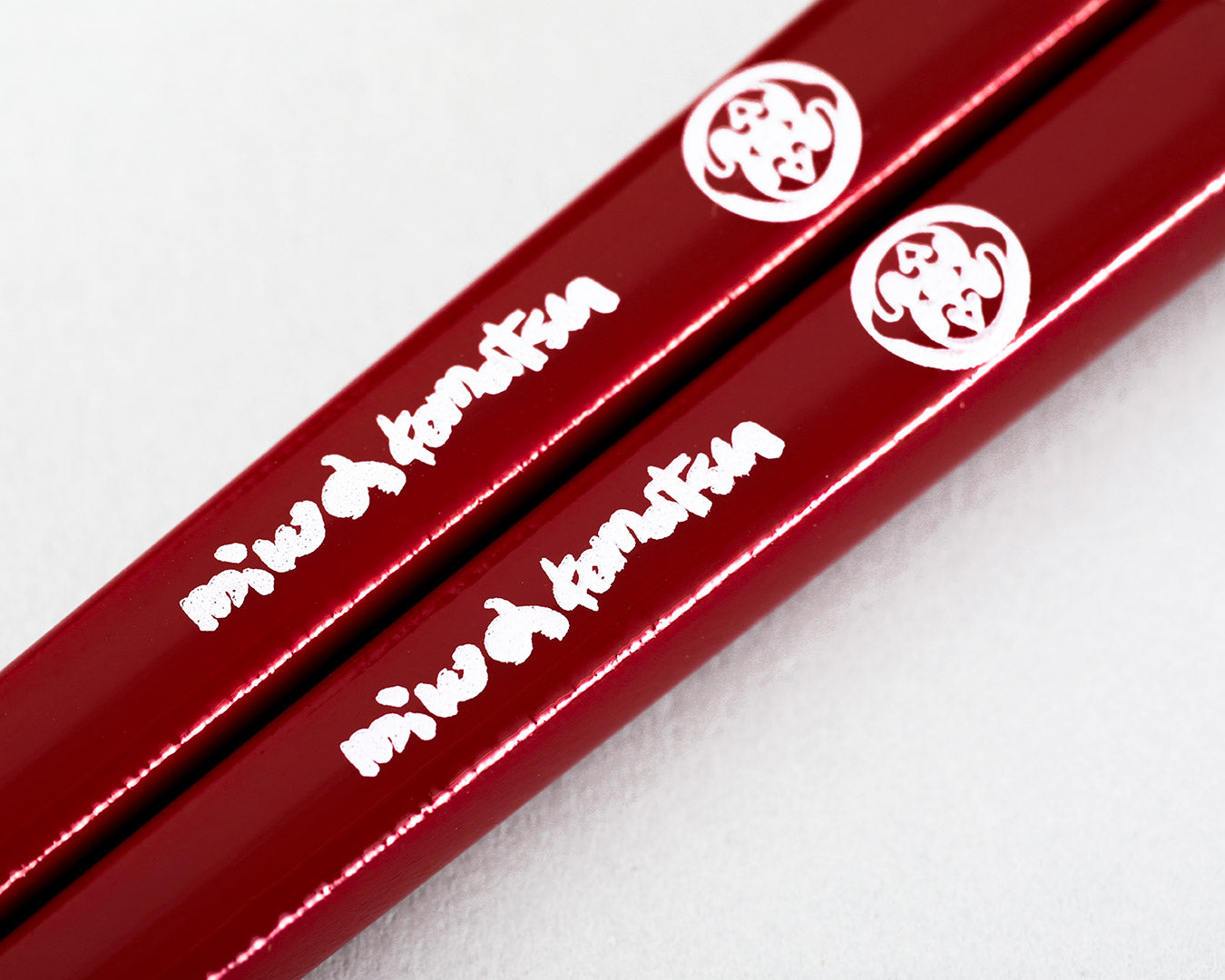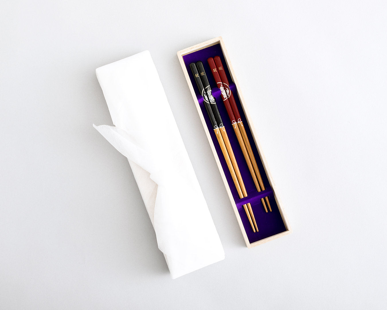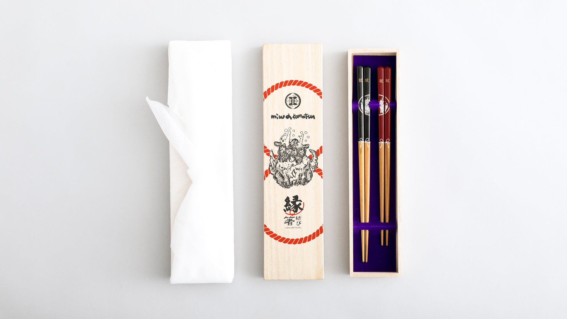 2014年に出雲大社へ作品《新・風土記》を奉納した小松美羽と創業明治40年出雲大社表参道に店舗を構える「縁結び箸ひらの屋」との間で生まれた「ご縁」を記念してコラボレーションが実現、構想から数年の歳月をかけ、今回特別仕様の「縁結び箸」が完成した。今回の特別な縁結び箸には、小松美羽の作品の中で二体の山犬様が出会い、愛を育む様子を描いた作品《山犬様 出会い 愛す》から引用された絵柄を外箱・お箸本体・小松さんからのメッセージが入ったしおりにプリント、二膳のお箸が揃うことで一つの絵柄が完成する仕様となっている。シンプルでありながら小松作品の魅力とお箸自体の素材の良さを感じてもらえる仕上がりとなっている。