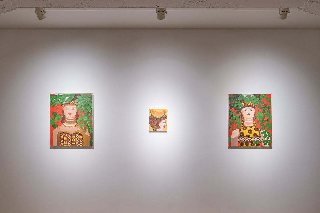 神木は、花木と人物が対等に共存する構図の中で、写実を歪めた表現を用い、美しさの裏に潜む違和感や謎を浮かび上がらせ、可愛らしさの奥に潜むミステリアスな空気感は、見る者の感性を静かに揺さぶりかけます。