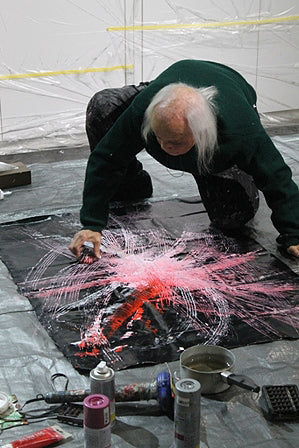 中学校の教師として嶋本昭三と同僚であった鷲見は嶋本の活動を横で見ていて、自分でもなにかできないかと考えていた。ある日、算盤にインクを付けて紙の上を滑らせると等間隔のラインが引かれ、スピード感のある不思議な模様が生まれた。