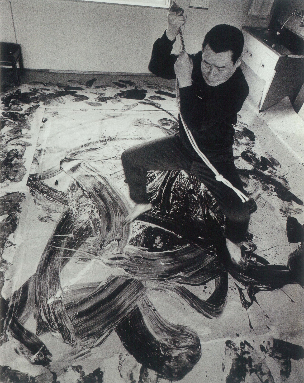 白髪一雄が発明した絵画制作スタイルは、足で描くというもので、これは「泥に挑む」というアクション行為から発展したものだと考えられるが、天井から下げた紐につかまって両足でカンバス上を滑るように描かれた作品はスピード感あふれるダイナミックなものとなる。