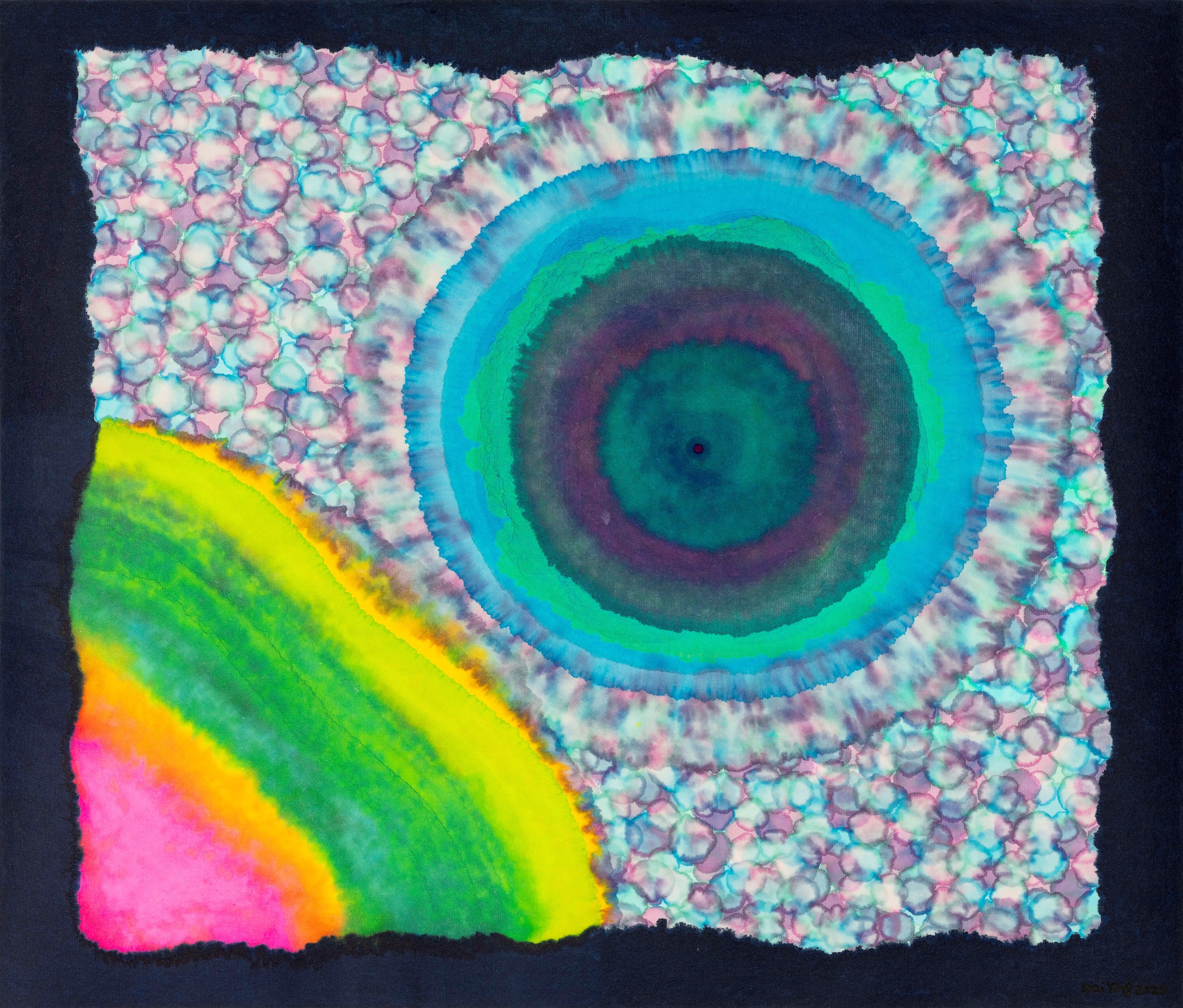 中央の緑の同⼼円状の形が、その周囲を取り巻く密な花模様と対⽐をなしている。左下の虹のような弧は均衡を揺るがし、画⾯に動きをもたらしている。作品は⽣命の場の多様性と⽣成的な状態を強調し、開かれた宇宙観を⽰している。