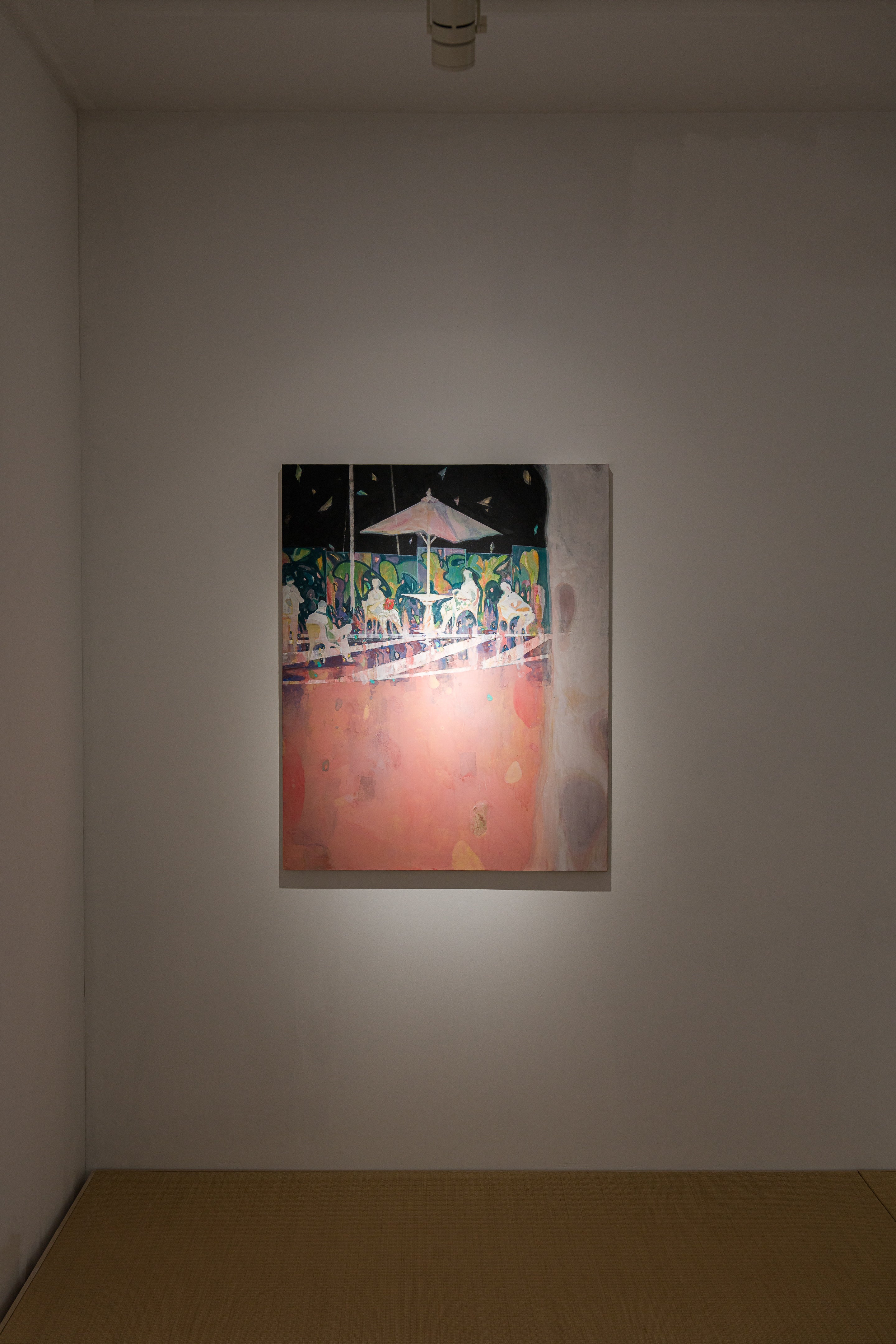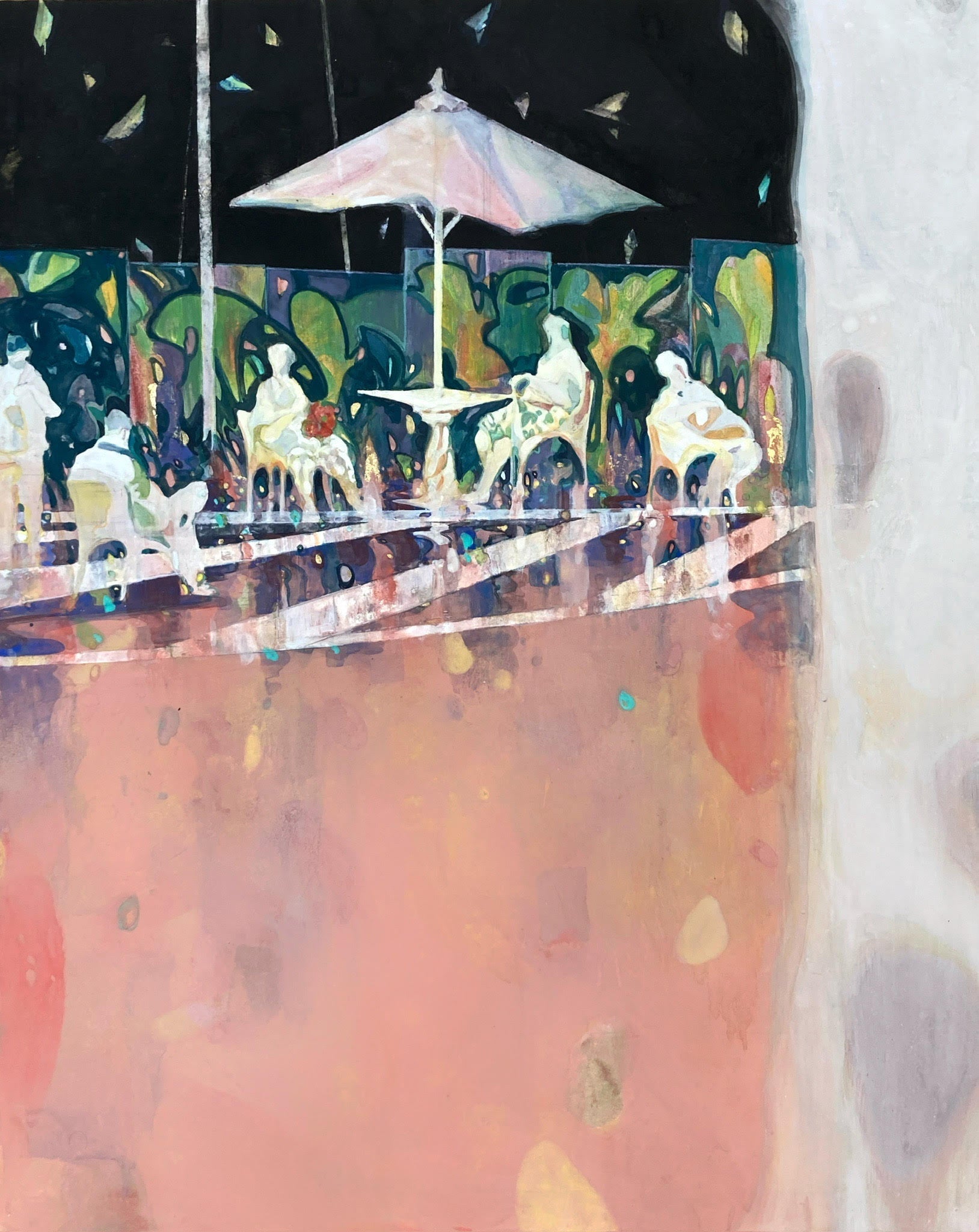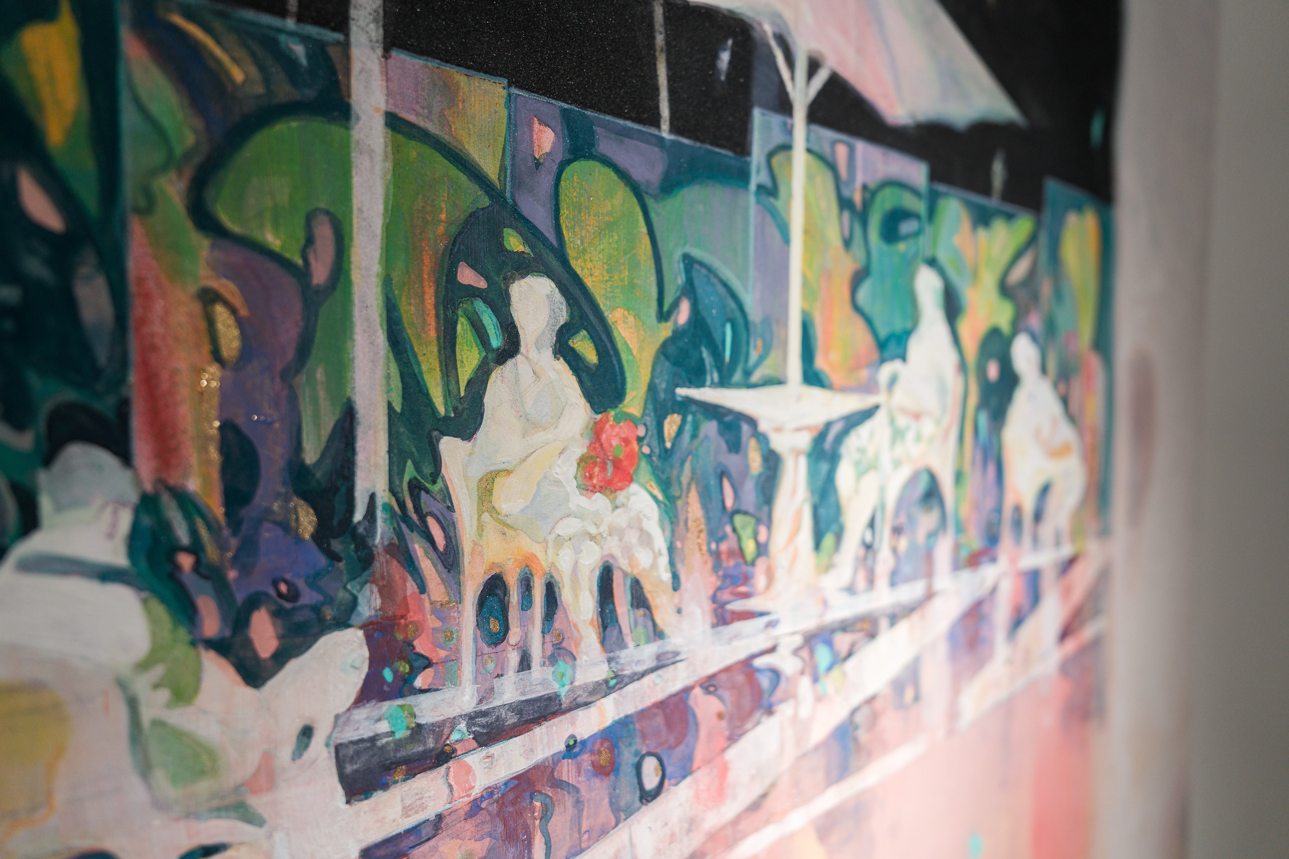Mineral pigments, Ink, Gold pigment, Silver leaf on Japanese paper mounted on wooden board