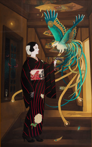 The foxes, having lived over a millennium, now possess two tails and wear sacred flaming jewels. One has transformed into a woman, clad in flowing garments of the Nara period, emerging under the night sky of Mt. Inari.