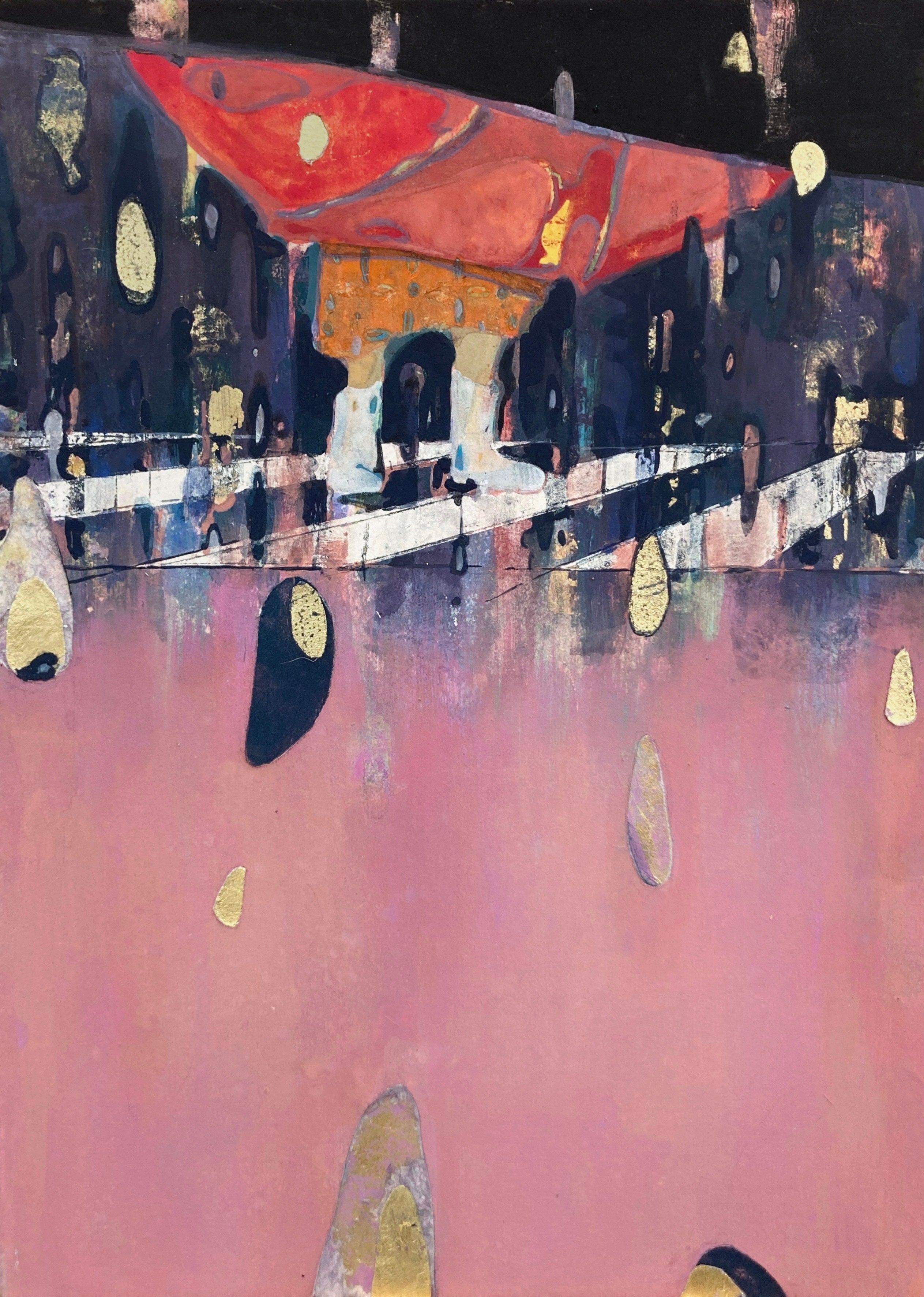 Mineral pigments, Ink, Gold leaf on Japanese paper mounted on wooden board